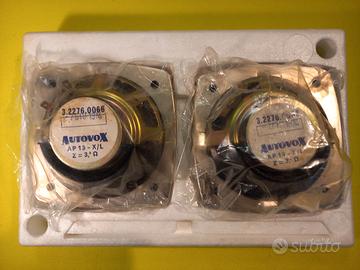 Coppia di altoparlanti originali AUTOVOX NUOVI, imballati, da montare su auto storiche. Costruiti nel 1974 e completi di cavi e viti. Provati e perfettamente funzionanti. Sono molto simili agli altoparlanti Voxson dell’epoca per cui possono essere montati sia con apparati vintage Autovox che Voxson di quegli anni. Possibilità di spedizione. Prezzo non trattabile. Per ogni informazione chiamare il 3487146039. Questa è una vendita tra privati, con esclusione di garanzia e con la formula “visto e piaciuto”. L’oggetto è venduto “così com'è" e non è prevista nessuna restituzione.