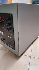 Il subwoofer attivo da 20 cm ha una potenza di 200W di picco con frequenza di taglio regolabile 40÷150 Hz inoltre ha la regolazione di fase continua da 0÷180°, non il solito selettore per l'inversione 0-180°.