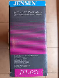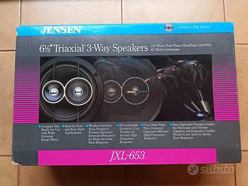 Rarissimi e introvabili altoparlanti per auto marca Jensen, modello JXL-653. Più unici che rari. Oggetti storici. Di un’epoca unica e irripetibile. I ruggenti anni 80 sono tornati. Quando l’autoradio in auto era tutto. Le casse non sono mai state montate, ma le menbrane hanno purtroppo i segni del tempo. Ma ciò non deve assolutamente scoraggiare. Oggi tutto è possibile. Un bravo tecnico/artigiano dell’audio è capace di sostituire la membrana danneggiata con una nuova e ridare nuovo splendore alle casse. È una procedura semplice e rapida. Dopo più di quarant’anni sono state uscite solo ora dalla loro scatola per fare le foto. Originali MADE IN USA. Tutte le informazioni necessarie sono nelle foto che pubblico. La scatola fornisce tutti i dati e dettagli necessari. Non chiedetemi su quale auto andavano montati perché NON lo so. Non sono stati testati. I cablaggi, fili, faston, morsetti e quant’altro sono ancora intonsi dentro la scatola. Sono stati per più di quarant’anni chiusi in un armadio. Oggi rinascono a nuova vita. Per un restauro di un’auto d’epoca, e non solo, o comunque per un’auto YOUNGTIMER sono il top. Hanno la qualità di un tempo. Non è roba fatta in economia come fanno oggi. Posso consegnare a mano, ma posso anche spedire. Unitamente si cedono anche un paio di fari Carello. Anch’essi degli anni 80. Sono usati, ma perfetti. Uno è di profondità, l’altro è di espansione. Le coperture, cosi come i fanali, sono integre, perfette. Misure 16 cm circa x 10 cm circa. Il costo è di 130 euro spediti, ovvero con 130 euro acquistate entrambi le coppie e compreso di spedizione. Spedisco ovunque, isole comprese. In qualsiasi luogo in Italia senza costi aggiuntivi. Preciso che la parola danneggiato fa riferimento solo agli altoparlanti e NON ai fanali. I fanali sono perfetti. Grazie.