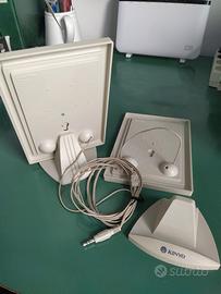 pulsante di accensione con spia rossa e regolazione del volume, coppia di altoparlanti per un effetto stereo, possono essere fissati a parete o appoggiati al tavolo.