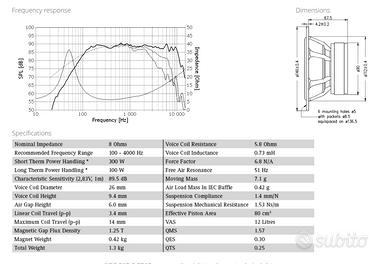VALUTO SOLO OFFERTE CONGRUE. SI INVITA A VERIFICARE IL VALORE COMMERCIALE DEGLI ALTOPARLANTI PRIMA DI INVIARE PROPOSTE DEL TUTTO INADEGUATE. Vendo 4 altoparlanti straordinari. Coppia di woofer 12” 30cm PEERLESS SLS 315 P830669 Coppia di midrange 5” 12cm: SEAS MCA 15 RCY DESCRIZIONE – Nuovi, mai montati. Li vendo per causa inutilizzo. Li ho solo misurati e rimessi nella scatola. Conservati sempre in ambiente domestico privo di umidità. Vengono spediti negli imballi originali. Ripeto condizioni pari al nuovo in imballi originali. Ideali per costruire un sistema tre vie di livello assoluto. Basta cercare online. Per acquistarli nuovi oggi spendete 470€ + eventuali costi di spedizione. ACCETTO ANCHE PROPOSTE SEPARATE PER WOOFER E MIDRANGE