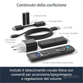 AMAZON FIRE TV STICK 4K MAX Lettore multimediale per la riproduzione di streaming TV, film e serie TV da Amazon Prime, Netflix, Disney +, Apple TV, YouTube ed altri con immagini sino a 4K Ultra HD, con supporto per Dolby Vision, HDR, HDR10+ ed avvolgente audio Dolby Atmos, da collegare alla TV tramite l'ingresso HDMI, possibilità di connessione cuffie tramite Bluetooth, con telecomando vocale Alexa con comandi per la TV. DETTAGLI Prodotto ufficiale Amazon, 1a. generazione, finitura nera opaca, processore Quad-core da 1,8 GHz., 8 GB di memoria, riproduzione sino a 4K Ultra HD, HDR e HDR10+ ed audio Dolby Atmos, Bluetooth 5.0 per associazione con cuffie, altoparlanti, controller di gioco ed altri dispositivi, Wi-Fi 6. IMPORTANTE L'accesso a servizi di streaming con Amazon Prime, Netflix, Disney +, Apple TV, richiede un abbonamento a pagamento, non incluso nell'acquisto della chiavetta, che andrà acquistato a parte dai rispettivi fornitori; inoltre, il raggiungimento di una determinata qualità video/audio è strettamente dipendente dal monitor e/o TV dove la Fire TV Stick sarà collegata. ARTICOLO NUOVO IN CONFEZIONE ORIGINALE Articolo nuovo, completo di confezione originale (aperta) con tutto il suo contenuto e batterie AAA (2); tutto il contenuto presenta ancora le protezioni di fabbrica, collegata in una sola occasione per verificarne il funzionamento. Articolo subito disponibile.