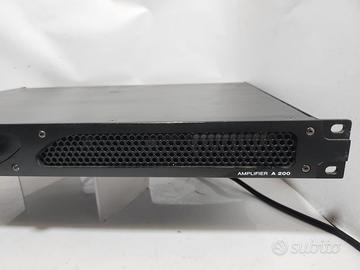 L'amplificatore A 200 è un amplificatore a 2 canali e fornisce 200W per canale su 4O. Integra la connessione ai diffusori con connettori a vite. Per il segnale in ingresso sono disponibili i connettori di tipo Phoenix. é possibile operare in modalità di funzionamento Stereo o Bridge, grazie all'impostazione tramite selettore posto su pannello posteriore. Il raffreddamento è con sistema a ventola controllato elettronicamente. Il tutto è integrato nelle dimensioni di 1 U Rack.