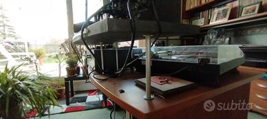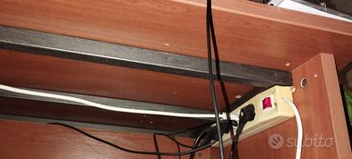 Ampia scrivania consolle audio-video color noce-grigio, con ripiano grigio.