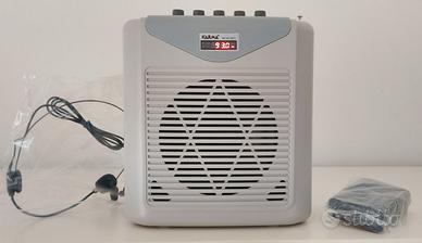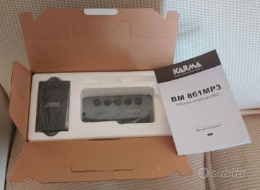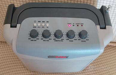 Karma BM 861MP3 amplificatore e cassa per VOCE con radio microfono wireless incluso + ingresso sorgenti di linea (aux) o CHITARRA ACUSTICA e BASI. Include radiomicrofono ad archetto. Effetto Echo regolabile incorporato. Funziona a batteria ricaricabile inclusa oppure alimentato direttamente da presa elettrica. Ricarica della batteria direttamente al suo interno collegandosi a una presa e selezionando Charge con il suo interruttore on off. Ottimo per BUSKERS Perfetto er GUIDE TURISTICHE itineranti. Circa 30 metri di raggio di azione del radio microfono COME NUOVO, (provato qualche volta in casa) con imballo originale, istruzioni e accessori. Batteria sempre ricaricata ad intervalli regolari per mantenerne l'efficienza. Compatto e leggero è trasportabile ovunque. E’ alimentabile sia da rete elettrica che da batteria interna ricaricabile (di facilissimo accesso per eventuale futura sostituzione). Completo di radiomicrofono VHF con archetto per amplificare la propria voce lasciando libere le mani. E’ possibile anche collegare un ulteriore microfono a filo tramite jack normale da 6,35mm e una ulteriore sorgente esterna tramite jack 3,5mm. Il jack da 3,5 funge anche da line out. Lettore di brani MP3 tramite presa per chiavetta USB (quindi anche ottimo sonorizzatore di ore all'aperto, o con la radio o con gli MP3 e funzionamento a batteria ricaricabile) Il pannello di comando presenta, oltre ai regolatori di volume, comandi rotanti per eco e toni. Incorpora un sensibile ricevitore FM per l’ascolto di radiostazioni, con 50 canali memorizzabili ed antenna estraibile. Portable mobile Speaker portatile Ideale BUSKING BUSKERS Altavoz amplificado con micrófono 40 WATT Risposta in frequenza 25 - 15000 Hz Dimensioni 213 x 235 x 105 mm Peso 2.5 kg istruzioni qui bit punto ly barra 3Lmjwro