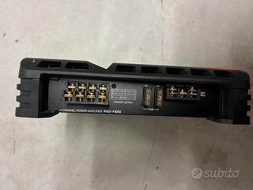 Massime potenze di uscitaPotenza massima totale: 640WPotenza nominale RMSPer canale in 4ohms (≤1% THD + N): 4 x 50WPer canale in 2ohms (≤1% THD + N): 4 x 75WBridged in 4ohms (≤1% THD + N): 2 x 150WSintonizzazione del suonoFrequenza di crossover (Fix, OFF / LPF / HPF selezionabili) 1/2 ch: 80 Hz (-18dB / oct)Frequenza di crossover (Fix, OFF / LPF / HPF selezionabili) 3/4 canali: 80 Hz (-18dB / oct)EQ (Equalizzatore): EQ basso Frequenza fissa 50 Hz _ Guadagno selezionabile 0 / + 6 / + 12 dB (3 / 4ch)DimensioniImpronta: 270 mm x 60 mm x 242 mmGeneraleRequisiti di alimentazione: 14,4 V CC (da 11 V a 16 V)Sensibilità di ingresso: 0,2 - 4,0 V (RCA IN)Impedenza di ingresso: RCA IN 10k Ω / SP IN 10k ΩRisposta in frequenza: 10 Hz - 50 kHz (+ 0, -1 dB)Altoparlante Impedenza: 4 o 2 ΩSegnale su rumore: rapporto S / N (IHF A ponderato, Riferimento: potenza nominale su 4 ohm) 90 dBPeso: 3,0 Kg