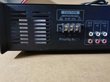 Amplificatoreq compatto per sistemi di filodiffusione PA. Sulle uscite a 100 volt dispone di 3 zone selettive a tasti. Possiede tre ingressi microfonici con volume indipendente, due jack e uno a morsettiera con priorità. Ha due ingressi Aux rca con volume indipendente e un’uscita Aux rca. Supporta 10 base microfoniche TS-BM270.