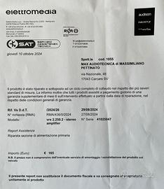 Fornisco Rapporto di Controllo eseguito in Audison ad ottobre 2024 (vedi foto, spesi 165 euro) che attesta il perfetto funzionamento dell’amplificatore e fornisce 6 mesi di garanzia.