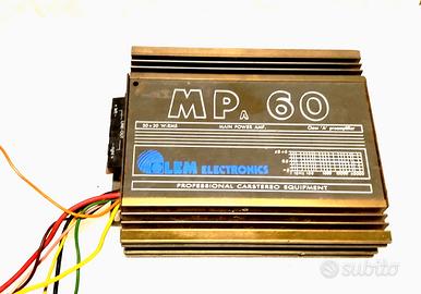 amplificatore audio per auto modello MP 60, LEM Electronics. componente "old school" impianti hi-fi car anni '80 o '90. Potenza: Eroga 30+30 Watt RMS. preamplificatore interno in Classe A. Risposta in Frequenza: da 10Hz a 40.000Hz. uscite di linea (LINE-OUT) e terminali per il collegamento dei diffusori (sinistro e destro) con morsetti a molla.