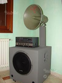 impianto audio che usa una vecchia tromba esponenziale Geloso degli anni '60 con un woofer da 12". L'elettronica è racchiusa su un vecchio contenitore di amplificatore Geloso degli anni '60.