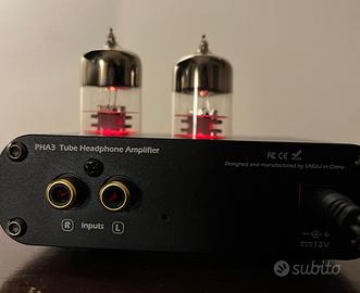 Sabaj Audio PHA3 è un amplificatore per cuffie con valvole 2x6j9 sostituibili la struttura è in alluminio, ha ingressi RCA posteriori e minijack frontale. per la Cuffia. Perfettamente funzionante e di piccole dimensioni (10x8 cm) , viene fornito con alimentatore, confezione originale e due valvole nuove aggiuntive 6J9p "testate dal venditore" con resa sonora diversa, bassi più presenti ed un ottimo equilibrio del suono nel complesso