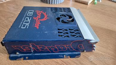 amplificatore della dragster DB 205 2 channel autoraffreddato con ventola indipendente e protezione auto restet impostazione low pass filter e regolazione gain l unica differenza due connettori modificati dall istallatore per attacco più rigido