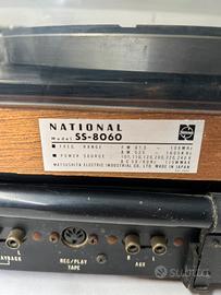 Impianto Stereo National SS 8060 Impianto stereo integrato prodotto nel 1970 dalla casa giapponese Matsushita con marchio National (pre National Panasonic, pre Technics). Il coordinato è composto da: Giradischi completo di Testina e Puntina - amplificatore stereo - sintonizzatore AM/FM L'amplificatore è dotato di: - ingresso + uscita TAPE per collegare un registratore a cassette - ingresso AUX per collegare un ulteriore apparecchio esterno E' possibile collegare due coppie di casse. INFO TELEFONO 3409661091 L'apparecchio è in buone condizioni estetiche e perfettamente funzionante. Dimensioni: larghezza cm 49 x profondità cm 46 x altezza cm 23 Caratteristiche tecniche: - potenza 40 + 40 watt IHF su 4 ohm Ingressi: - tape (ingresso RCA + DIN) - aux Controlli: - volume - alti - bassi - bilanciamento - selettore ingressi - selettore mono/stereo - selettore casse Uscite: - altoparlanti - cuffie