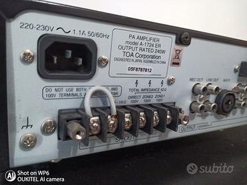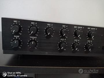 Amplificatore mixer con 9 ingressi di mixaggio, 6 ingressi microfonici bilanciati con jack combinato XLR/fono, alimentazione phantom commutabile separatamente, di cui due ingressi possono essere commutati su microfono o ad alta sensibilità. Tre ingressi di registrazione, di cui 2 ingressi ciascuno con due jack RCA (stereo) e un ingresso con jack combinato XLR/fono; un connettore di registrazione per dispositivi di registrazione con 2 prese RCA; collegamento in loop di un dispositivo di elaborazione del segnale (ad esempio equalizzatori) tramite jack RCA; connessione per telecomando e interruttore di accensione remoto; connessioni per altoparlanti con morsetti a vite; possibilità di commutare due zone altoparlanti e un'uscita diretta per altoparlanti, controllo di alti e bassi, controllo delle somme; indicatori di livello di uscita, selezione delle zone e alimentazione.