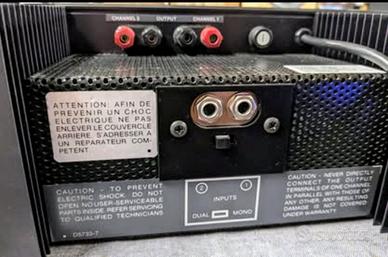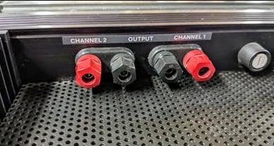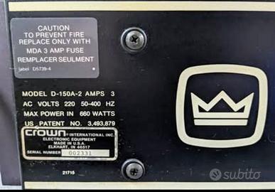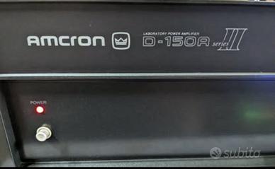 Amplificatore Finale di Potenza Stereo Amcron Crown D150 Mk II; amplificatore finale Made in USA, colore nero con scocca in metallo, alette rack, ingressi Jack 6,3 mm, 75 watt per canale oppure 150 watt in mono ad 8 Ohm, straordinariamente ben suonanti, risposta in frequenza 20 Hz a 20 kHz, peso dell’insieme circa 12 kg, condizioni generali ottime, in vendita a 450,00 Euro. Contatto per info al 335-6165594; per interessati è disponibile altro materiali Hi-Fi: ampli, casse, CD, sinto e giradischi, ribordatura altoparlanti e woofer, spallette in legno personalizzate con marcatura laser, riparazione teline, cappe giradischi, restauro Technics SL 1200 e 1210, materiale visibile ed ascoltabile a Busto Arsizio, posso spedire.