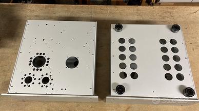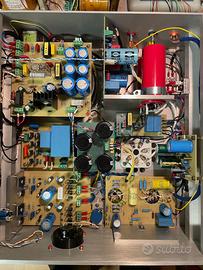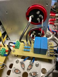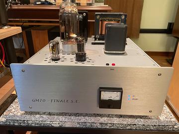 Coppia di finali SE di GM70 con driver 10EM7- pozzo di corrente anodica, cathode follower di 6BL7 in parallelo per possibile classe A2, 4dB di controreazione ( escludibile), uscita 6ohm non invertente, alimentazione anodica con trasformatore toroidale resinato, sequenza di accensione in 3 tempi, autoprotezione della valvola finale in ogni condizione di guasto.