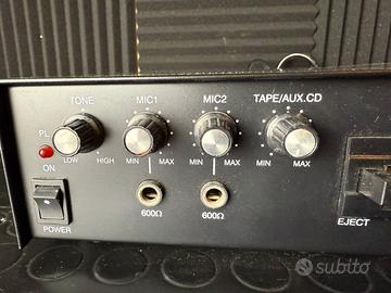gbc ka-918ar, apparecchio audio con lettore di cassette integrato, uscita di potenza da 15W RMS (50W di picco) per diffusori da 4-16 Ohm e ingressi per lettore CD e microfoni. Dispone anche di un'uscita per il collegamento di una tromba aggiuntiva per uso in auto e ha dimensioni di 240x7 mm.