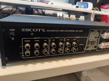 Vendo Scott 425A, amplificatore Hi-Fi vintage anno 1981, apprezzato per musicalità, affidabilità e qualità costruttiva. Ottime condizioni estetiche e funzionali, pronto all’uso. 35 W per canale su 8 Ω Amplificatore a stato solido Ingressi: Phono, Tuner, Aux, Tape Controlli di tono, bilanciamento, uscita cuffie Suono caldo, naturale e molto musicale, tipico Scott 🔧 Il precedente proprietario ha fatto eseguire una revisione generale da tecnico specializzato, mantenendo inalterata l’originalità dei finali. Uscite diffusori modificate con pratici mammut, solidi e funzionali. Manuale originale Scott incluso. Ideale per audiofili e amanti del vintage, ottimo con diffusori ad alta efficienza. Spediziome con super imballo garantito. Video dimostrativi disponibili su richiesta Contatti in privato. Massima serietà.
