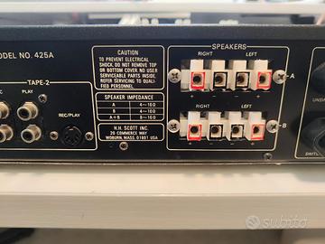 Vendo Scott 425A, amplificatore Hi-Fi vintage anno 1981, apprezzato per musicalità, affidabilità e qualità costruttiva. Ottime condizioni estetiche e funzionali, pronto all’uso. 35 W per canale su 8 Ω Amplificatore a stato solido Ingressi: Phono, Tuner, Aux, Tape Controlli di tono, bilanciamento, uscita cuffie Suono caldo, naturale e molto musicale, tipico Scott 🔧 Il precedente proprietario ha fatto eseguire una revisione generale da tecnico specializzato, mantenendo inalterata l’originalità dei finali. Uscite diffusori modificate con pratici mammut, solidi e funzionali. Manuale originale Scott incluso. Ideale per audiofili e amanti del vintage, ottimo con diffusori ad alta efficienza. Spediziome con super imballo garantito. Video dimostrativi disponibili su richiesta Contatti in privato. Massima serietà.