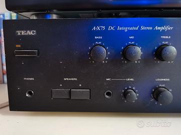 Amplificatore HiFi vintage TEAC A-X75 DC Integrated Stereo Amplifier (1988-89) Power output: 75 watts per channel into 8Ω (stereo) Frequency response: 5Hz to 40kHz Total harmonic distortion: 0.05% Input sensitivity: 0.22mV (MC), 2.2mV (MM), 115mV (line) Signal to noise ratio: 65dB (MC), 75dB (MM), 94dB (line) Output: 100mV (line)
