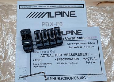 Potenza effettiva rilevata da Alpine documentata assieme al manuale di istruzioni 164W RMS per canale