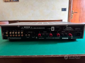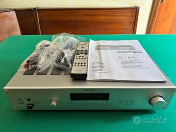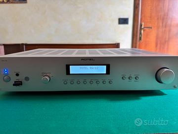 Vendo amplificatore integrato Rotel RA-12 colore silver, tenuto benissimo, completo di tutti gli accessori e manuale istruzioni, ma senza imballo originale. L'amplificatore Rotel RA-12 offre tutta la connettività di cui hai bisogno per vivere al meglio tutta la tua musica digitale, e una tecnologia audiofila all'avanguardia che ti aiuterà a riprodurla in tutto il suo splendore. Caratteristiche tecniche: 2 x 60 W di alta potenza classe AB (Tutti i canali pilotati, 8Ω) Pannello frontale USB per dispositivi iOS Ingresso phono MM per il collegamento del giradischi Dongle Bluetooth incluso Converter digitale/analogico Wolfson high-end 24-bit/192kHz