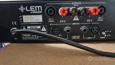 vendo amplificatore Lem modello procon 750 usato pochissimo con le seguenti caratteristiche: Specifiche di potenza Potenza d'uscita EIA (1 kHz, max THD 1%) 4 ohm: 375W + 375W 8 ohm: 215W + 215W Specifiche elettroniche Sensibilita' d'ingresso 0dB (0.775V) Impedenza d'ingresso 10 kohm (bilanciato) Risposta in frequenza 10Hz - 50kHz (-0,5dB) Diafonia -82dB (1kHz) Rapporto S/N -98dB Distorsione (THD) Inferiore a 0,1% (ref 20Hz - 20kHz) Specifiche generali Protezioni Protezione termica sul trasformatore; protezione termica sul dissipatore; protezione dal corto circuito Controlli Interruttore di accensione, controllo di livello per ciascun canale a 21 scatti Indicatori Power on: 1 LED verde Signal: 2 LEDs verde Clip: 2 LEDs rossi Connessioni Ingresso: 1 XLR-F + 1 XLR-M in parallelo per ciascun canale Uscita: 1 speakon 4 vie per ciascun canale Alimentazione Vedi targhetta informativa sull'apparato Dimensioni (L x A x P) 483 x 88 x 370 mm Peso 12,8 kg Per qualsiasi informazione contattatemi telefonicamente al numero 3497865049.