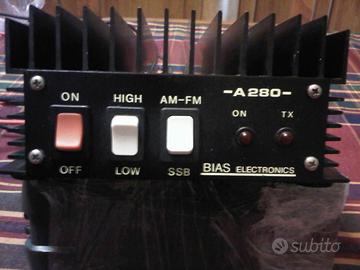 Da mia collezione cedo a malincuore un Eccellente amplificatore della mitica Bias mod.A280 12V di costruzione Italiana doppio transistors MRF 455 Motorola (nello specifico il lineare oggetto di vendita in questo annuncio monta ancora i finali di fabbrica non cotti e per nulla rimaneggiato , in più che buone condizioni estetiche dati gli anni dall'uscita). TOP dei lineari CB per la 27!. Con finali Originali non cotti, perfettamente funzionante.