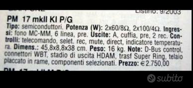 NB: Disponibile il suo lettore CD cordinato, il Marantz CD-17 mkII, uno dei lettori più musicali mai fatti, costo di listino di 1450€, vendo a 450€.