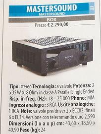 amplificatore Mastersound box in classe a valvolare 35 watt - 6 valvole el34 - 2 valvole ecc82 esteticamente che elettricamente assolutamente perfetto qualsiasi prova di ascolto presso la mia abitazione amplificatore e senza il telecomando questo modello era uscito non in dotazione visto il suo peso di 24kg non faccio una eventuale spedizione solo consegna a mano dispongo del suo imballo originale ma senza il polistirolo interno per eventuali informazioni anche tramite wathsapp al numero 3200928237 Alberto. ( prezzo non trattabile)