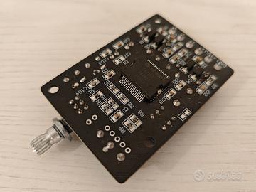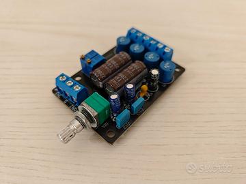 Autocostruito, basato su 2 schede audio TRIPATH TA2024, studiato per biamplificazione, eroga fino a 15W per canale, quindi 30 Watt per cassa acustica in biamplificazione. Regolazione del volume indipendente per ogni scheda amplificatore (R & L), Voltmetro sul lato per monitorare la tensione della batteria interna. Ingressi liberi ed indipendenti per ogni canale, quindi utilizzabile in svariate configurazioni. Alimentato con batteria piombo 12V 7Ah per escludere ogni possibile interferenza dalla rete elettrica. Ricaricabile con un comune caricabatterie 12V. In abbinata un selettore ingressi di livello semi HIFI TCC TC-754 con 3 ingressi PRE ed un PHONO con equalizzazione RIAA, alimentato dallo stesso ampli per mantenere la catena separata dalla rete, ma comunque comprensivo del suo alimentatore originale. Perfettamente funzionante, vendo per modifica alle configurazioni audio del mio impianto