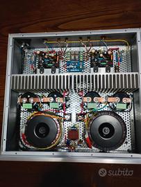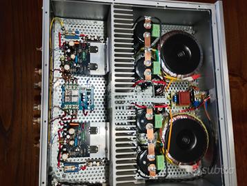 Per cambio tipologia impianto vendo finale di potenza a MOSFET originali Hitachi. Costruzione dual-mono con alimentazione surdimenzionata ottima componentistica e bensuonante. Potenza 100/150 W RMS rispettivamente su carico di 8/4 Ohm - banda passante 10-80000 Hz - distorsione armonica totale 0,02% - rapporto S/N 105 db - Sensibilità d'ingresso per max potenza di uscita 0,81VR.M.S.(4 Ohm) - 1V R.M.S. (8 Ohm) Dimensioni: 40x37x13,5 lxpxh- Peso kg 20 c.a. Preferisco vendita diretta dopo visione/prova ma posso anche spedire adeguatamente con costo da concordare.