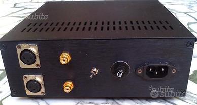 Amplificatore per cuffie in classe AB, elettronica discreta con finali ed ingressi Mosfet, capace di pilotare 2 cuffie contemporaneamente e fino a 4 cuffie(32 ohm) in parallelo. Può erogare 4Watt con un carico di 6 ohm. Nessun condensatore nella linea audio, ingressi linea RCA e Bilanciato XLR. Parameters: Output power: 4Watt x2/ 8? Frequency range 4Hz-3db, 50KHz-3db THD 99db Damping Factor: 80/ 8?( Res. uscita 0.1?) Pilotaggio Mosfet: Suspended driver circuit. (TotemPole). Ingressi: Bilanciato XLR e sbilanciato RCA dorati con levetta per la scelta. Protezione: 1 Fus.(200mA) ingresso primario. Peso: 2.5Kg. Dimensioni: 23x23x9cm. Chassis: Alluminio nero, coperchio superiore inferiore in acciaio. 2 Uscite per Cuffia 3mm. Alimentazione: 220Vac. Suono dettagliato, morbido, preciso, grazie ai finali Mosfet della Fairchild, grande capacita di corrente. Offro garanzia direttamente dal mio laboratorio. Potete visitare il mio sito o fare una ricerca con la parola "tecnicohifihiend" per vedere altre offerte e lavori realizzati. Grazie.