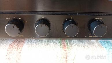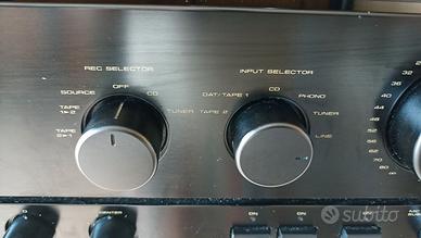 Controllo Toni (bassi ed alti) Tasto Direct (per l'esclusione controlli toni e bilanciamento) Potenza RMS sui due canali: - 95 Watt su 4 Ohm - 70 Watt su 8 Ohm Ingressi: 1) Phono, capace di accettare sia testine di tipo MM (2,5 mV / 50 kOhm), sia di tipo MC (0,2 mV / 100 Ohm) 2) CD 3) Tuner 4) Line, 5) Tape In Uscite: Tape Out Cuffie2 Doppia coppia di altoparlanti Peso di circa 14 Kg! Dimensioni L x P x H 420 x 435 x 162 mm.
