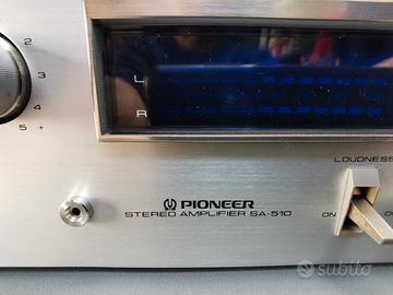 Il Pioneer SA-510 è un amplificatore stereo integrato vintage introdotto nel 1980, apprezzato dai collezionisti per il suo tipico design dell'epoca "Blue Line" con indicatori di potenza a LED blu. Caratteristiche Tecnich Caratteristiche Tecniche Principali Potenza di uscita: 33 Watt per canale su 8 ohm (stereo) Risposta in frequenza: Da 20hz a 20khz. Distorsione armonica totale (THD): Estremamente bassa, pari allo 0.03% Rapporto segnale/rumore: 68dB per ingresso Phono MM e 85dB per ingressi linea. Dimensioni: 420 x 94 x 347 mm Peso:Circa 6 kg Connettività e Controlli L'apparecchio offre una configurazione classica per l'epoca, ideale per chi vuole allestire un sistema Hi-Fi analogico: Ingressi: Phono (per giradischi), Tuner, Aux e due ingressi Tape (Rec/Play). Uscite diffusori: Supporta due coppie di casse (A e B). Controlli tono: Regolazione separata di bassi e alti (+-10dB) oltre alla funzione Loudness per migliorare la dinamica a bassi volumi. Filtro Subsonico: Utile per eliminare i disturbi a bassissima frequenza generati dai dischi in vinile rovinati (15Hz, dB /oct) Il Pioneer SA-510 è un amplificatore stereo integrato vintage introdotto nel 1980, apprezzato dai collezionisti per il suo tipico design dell'epoca "Blue Line" con indicatori di potenza a LED blu. Caratteristiche Tecnich Caratteristiche Tecniche Principali Potenza di uscita: 33 Watt per canale su 8 ohm (stereo) Risposta in frequenza: Da 20hz a 20khz. Distorsione armonica totale (THD): Estremamente bassa, pari allo 0.03% Rapporto segnale/rumore: 68dB per ingresso Phono MM e 85dB per ingressi linea. Dimensioni: 420 x 94 x 347 mm Peso:Circa 6 kg Connettività e Controlli L'apparecchio offre una configurazione classica per l'epoca, ideale per chi vuole allestire un sistema Hi-Fi analogico: Ingressi: Phono (per giradischi), Tuner, Aux e due ingressi Tape (Rec/Play). Uscite diffusori: Supporta due coppie di casse (A e B). Controlli tono: Regolazione separata di bassi e alti (+-10dB) o