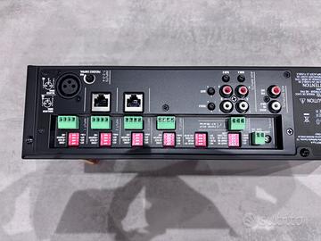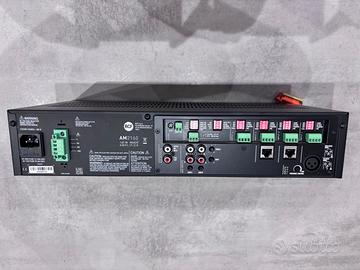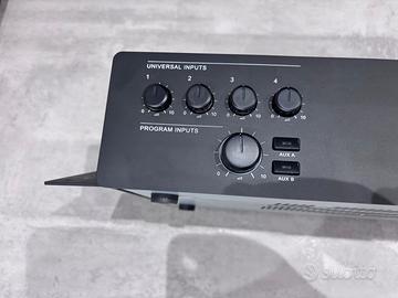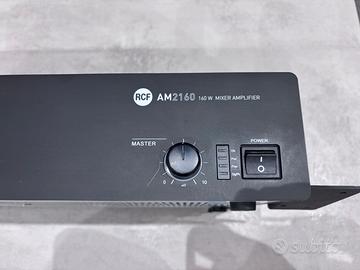Vendo Rcf AM 2160 con amplificatore integrato da 160w prezzo trattabile Amplificatore 160 W versatile per la diffusione di annunci e musica L'ingresso 1 dispone di connettore XLR Circuito di rilevazione del segnale (VOX) con funzione di attivazione della priorità sull'ingresso 1 Comando di priorità attivabile esternamente sugli ingressi 1, 2, 3 e 4 Gli ingressi 2 e 3 hanno inoltre un connettore RJ 45 per la rapida connessione di una base microfonica dedicata BM 3001 Gli ingressi universali hanno un controllo di presenza comune Ogni ingresso universali ha un filtro Passa Alto dedicato utili per migliorare l'intelligibilità della voce 2 Ingressi ausiliari, inseribili tramite pulsanti frontali con indicatori LED Ingressi ausiliari con controlli di tono separati Uscite ausiliarie per inviare il segnale delle sorgenti musicali ad amplificatori addizionali oppure ad una centrale telefonica AM 2160 è un mixer-amplificatori aventi 4 ingressi audio mic.-linea su connettori rimovibili e 2 ingressi ausiliari per eventuali sorgenti sonore esterne (es. lettori CD, sintonizzatori radio, ecc.). La potenza nominale di uscita dell amplificatore è pari a 160 W RMS. L’uscita per diffusori acustici è disponibile sia a bassa impedenza (min. 4 O) oppure a tensione costante 100 – 70