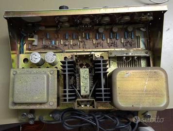 Amplificatore RCF modello AM8100 a transistor, potenza 100W RMS, impedenza d'uscita 2-4-16-100 ohm, risposta di frequenza 100-15000 Hz, produzione primi anni '70. Mobile in metallo di dimensioni 400x305x160 mm, peso 17,5 Kg. Lo stato esteriore è buono, ma non avendo strumentazione adatta non se ne garantisce il funzionamento.