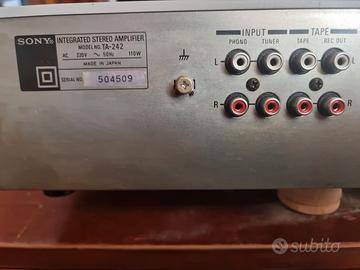 Sony TA-AX205 è un amplificatore stereo integrato vintage, prodotto a metà degli anni '80 (circa 1985) in Giappone. È un dispositivo solido e versatile, ideale per chi cerca un suono analogico classico senza spendere cifre esorbitanti. Caratteristiche Tecniche Potenza di uscita: 30 watt per canale su 8Ω (stereo). Risposta in frequenza: Da 15Hz a 70kHz. Distorsione armonica totale (THD): 0,08%. Ingressi audio: Dotato di connettori RCA per Phono (giradischi), Tuner, CD, Video e Tape. Uscite diffusori: Supporta due coppie di altoparlanti (Sistema A e B) con impedenza da 8Ω a 16Ω. Controlli: Regolazione di Bassi, Alti, Bilanciamento e funzione Bass Boost per enfatizzare le basse frequenze. Dimensioni e Peso: 430 x 106 x 250 mm per un peso di circa 4,7 kg