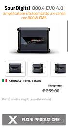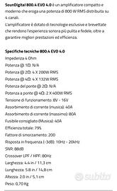 amplificatore ultra compatto digitale (classe D) 4 canali SounDigital SD 800.4 EVO, 800w RMS nel palmo di una mano. perfette condizioni sia estetiche che funzionali. Completo di scatola originale. Specifiche tecniche in foto.