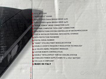 Vendo amplificatore Setg k204 serie rossa limited come in foto. L’amplificatore funziona perfettamente, vendo causa abbandono passione e vendita auto. Possibilità di provarlo se venite provvisti di impianto elettrico. L’amplificatore era montato senza lamierino centrale perché installato su plexiglass. Le foto parlano da sé per le condizioni elettriche del prodotto. Disponibili altoparlanti da 20cm e tweeter. Prezzo rivisto se preso tutto in blocco