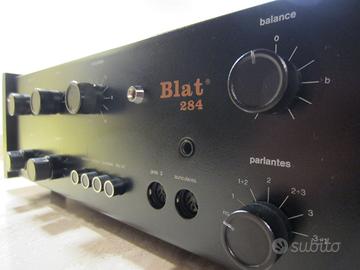 Amplificatore Stereo Blat 284. Potenza d'uscita: 72 + 72 W (RMS) / 8 Ohms 90 + 90 W (RMS) / 4 Ohms Risposta in Frequenza: 20 Hz - 20Khz +/- 1dB Ingressi Phono: Phono 1 / Phono 2 Sensibilità: 2 mV Impedenza: 47 KOhms Ingressi Linea: Radio / Aux./ Grab 3 (Cassette or Reel Player) Monitor 1 & 2 Sensibilità: 240 mV Impedenza. 10 KOhms Uscita di segnale: 240 mV Impedenza: 1 KOhm Ingresso Main in: Sensibilità: 1.5 Volts Impedenza: 10 KOhms Uscita Pre Out: Sensibilità: 1.5 Volts Impedenza: 1 KOhm Uscite Altoparlanti: 3 Zone configurabili con Switch Rotativo nel pannello frontale Uscite per Cuffie: 1 Din + 1 Jack Controllo di Tono Butterworth separati per ogni canale. Bass: 100 Hz (+/- 10dB) (Bajos) Treble: 10Khz (+/- 10dB) (Agudos) Selettore Loudness (Sonoridad) Selettore Filtro Passa Basso (Filtro AF) Selettore Modo dei canali d'ingresso Disponibili Gratuitamente cavi DIN 5 a 4 RCA per il collegamento delle sorgenti.