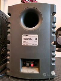 Amplificatore Teac PowerMoax 1500 + Casse Caratteristiche tecniche: – Subwoofer: 10.16 cm woofer – Center: 7.6 cm media/alta frequenza – Satelliti: 5×5 cm media/alta frequenza – Scudo magnetizzato – P.M.P.O.: Subwoofer 500W – Satelliti 5 x 200W – RMS: Subwoofer 20W – Satelliti 5 x 5W – Banda passante: Subwoofer 20?120Hz – Satelliti 5 x 80?20.000Hz – 4 tipologie di entrata a selezione diretta – Entrata numerica: coassiale, ottica – Entrata ottica: Playstation2-ready – Differenti tipologie di suono: ProLogic, Dolby Digital, stereo, Theatre, Hall – Alimentazione: 220-230V – Display accensione/spegnimento – Manuale di istruzioni – Dimensioni: Subwoofer 194x233x230mm – Satelliti: 96x107x109mm – Amplificatore: 112x233x301mm