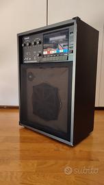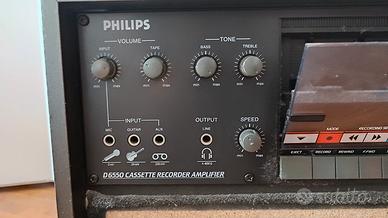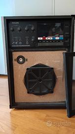 Amplificatore Philips anni '80 modello D 6550. Tre ingressi: microfono, chitarra, nastro magnetico. Ha anche un registratore a cassette incorporato (da revisionare un tasto). Il pannello davanti all'altoparlante è autocostruito.