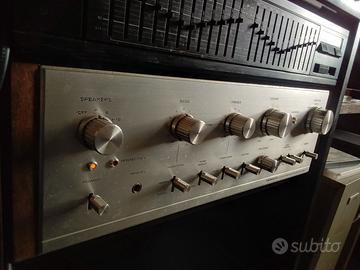 Amplificatore Pioneer modello SA-7100 Vintage del 1974. La risposta in frequenza e' da 7Hz a 80Khz valore notevole per l'epoca anni 70. Distorsione Armonica 0,5% allora molti altri ampli stavano sull'1%. Fattore smorzamento nella norma 40. Sensibilita' ingresso 2mV per microfono, lo standard 2,5mV per giradischi, 150mV in linea. il rapporto segnale-rumore e' di 90DB. Dimensioni 43 x 13,8 x 34,1 cm, peso notevole per tutta la qualita' interna messa, 10,1 Kg. Sul retro Ingressi per 2 coppie di casse Separazione pre-finale che da' la possibilita' di inserire un equalizzatore in uso per tutto anche del giradischi. un doppio ingresso per microfono, uno per Tuner(radio), due ingressi per 2 giradischi, due doppi ingressi entrata-uscita per lettori cassette, a Registratori a bobine, DAT o altro. e 2 doppi ingressi AUX per 2 lettori CD o quel che volete. Oltre alle normali manopole per bassi, acuti e bilanciamento, 2 chicche, selettori turnover da 200 a 400Hz per bassi, e l'altro da 2,5 a 5Hz per acuti. Nella norma che vi sia anche il selettore Tone-Defeat per riportarlo al suono lineare senza agire su altro, e il selettore Muting se avete bisogno di abbassare momentaneamente il volume. Ingresso cuffia sul frontale. Rimane il volume e quello piu' grosso per scegliere le varie sorgenti tranne i due tape con selettori a parte. Le scritte sul frontale non sono come adesso dipinte. Ma come una volta con oggetti di pregio. Scolpite. Impossibile cancellarle a meno lo vorreste fare apposta. Abituato a esporre a pari al nuovo e questo lo e' anche nel rivestimento in legno, non mi piace che l'interno non sia come l'esterno. All'ascolto e controllo si e' deciso di sostituire i 2 condensatori centrali che non erano scoppiati come in foto ma vecchi. Quindi non piu' efficienti. Messi equivalenti e di pregio, l'oggetto e' a nuova vita nell'ascolto. 20 Watt dichiarati per canale in 8 OMS. Ma una stanza normale la riempie gia' al 60% del volume. E al massimo non distorce. Si spedisce.