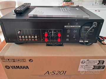 Vendo amplificatore integrato Yamaha A-S201, colore nero. L'oggetto è pari al nuovo, usato pochissimo nessun segno di usura o graffio. Completo di tutto il corredo originale: con scatola, polistirolo e protezioni interne. Telecomando originale e manuali. Caratteristiche: Potenza: 100 W + 100 W (su 8 ohm). Ingresso Phono MM per giradischi. Modalità Pure Direct e uscita cuffie. Disponibile per ritiro a mano o spedizione tracciabile con TuttoSubito (l'imballo è il suo originale).