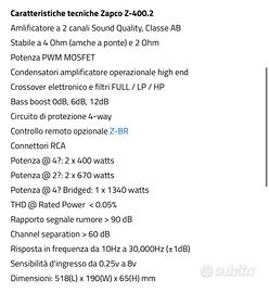 Come da titolo, vendo amplificatore zapco serie z-400.2, acquistato meno di 2 anni fa e smontato causa vendita auto. Mai sfruttato al massimo delle sue potenzialità.