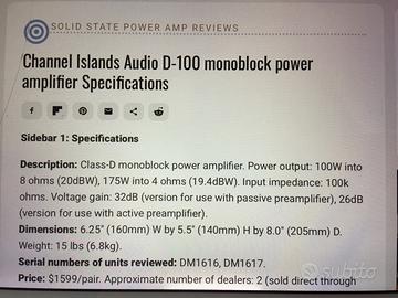 Vendo coppia amplificatori finali monoblocco CHANNEL ISLANDS AUDIO D-100. (Consegna a mano).