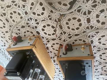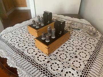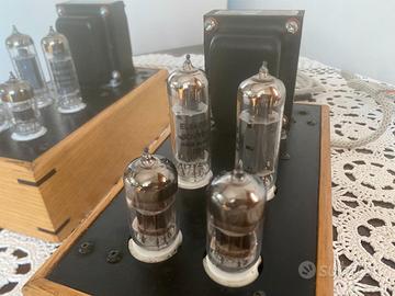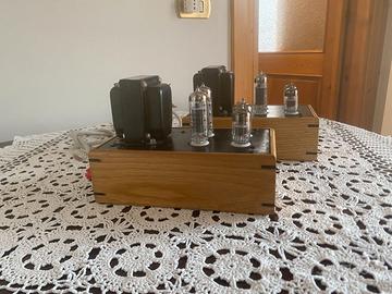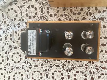 .Questo piccolo amplificatore monoblocco utilizza due pentodi EL84 in configurazione push-pull. Le valvole driver sono 12AX7A, in configurazione differenziale. L'unità utilizza un alimentatore esterno da 15 V CC. Un regolatore e convertitore di tensione interno fornisce i 12,6 V CC per i filamenti e la tensione di placca di 250 V CC. L'alimentatore esterno stabilizzato con ingresso 110 V/220 V e uscita 15 V CC è escluso dall’unita’. Poiché l'MB26 funziona con un alimentatore da 15 V CC, può anche essere alimentato da una batteria da 12 V per auto, quindi puoi portarlo in viaggio.