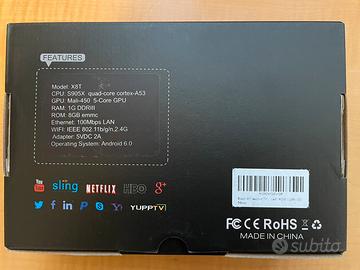 Bqeel X8T Android TV Box /Bluetooth 4.0 CPU: S905X quad-core Cortex-A53 GPU: Mali-450 5-Core GPU RAM: 1G DDR III ROM: 8GB emmc Ethernet: 100Mbps LAN Adapter: 5VDC 2A Operating System: Android 6.0