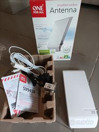 Antenna amplificata da esterno marca ONE FOR ALL modello SV9450, ottima per ricevere segnale DVB da antenne emittenti entro 25km. Vendo per inutilizzo in confezione originale completa di tutti gli accessori. Utilizzata in veranda (mai pioggia) ha sempre acquisito un ottimo segnale consentendo la visione di tutti i canali digitali. Consegna a mano su Roma o spedisco.